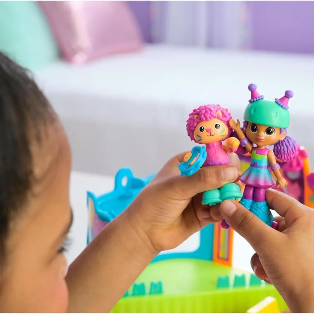 Set Gabby's Dollhouse Party Room s koturaljkama donosi čarobne avanture ravno u dječju sobu. Djeca mogu voziti Gabby i Mačka Martyja po sobi, ukrašavati je naljepnicama i otkrivati senzorne igračke na zidu. Modularni dizajn omogućuje povezivanje s drugim setovima i izgradnju vlastitog bajkovitog svijeta.